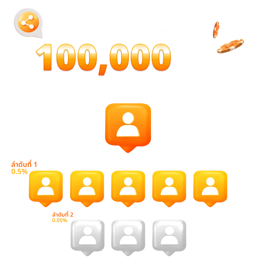 แนะนำเพื่อนลำดับที่ 2• ท่านจะได้รับส่วนแบ่งเริ่มต้นในดับที่ 2 ตัวอย่าง: ลูกค้าแทง 10,000 บาท ท่านจะได้รับ 5 บาท (ได้ทุกรายการแทงของลูกค้า)